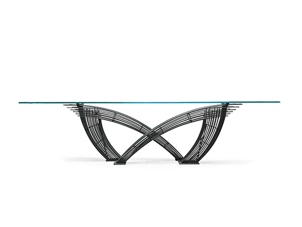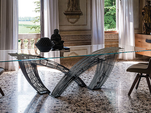 The modern table Hypo, is the harmonious encounter between strength and refinement in a modern dining room. The metal shapes extend and intersect creating an intense composition, in stark contrast to the horizontal glass top, which allows you to appreciate the base in its entirety.