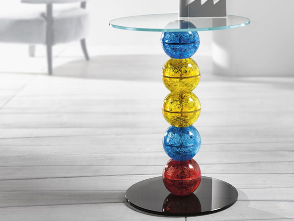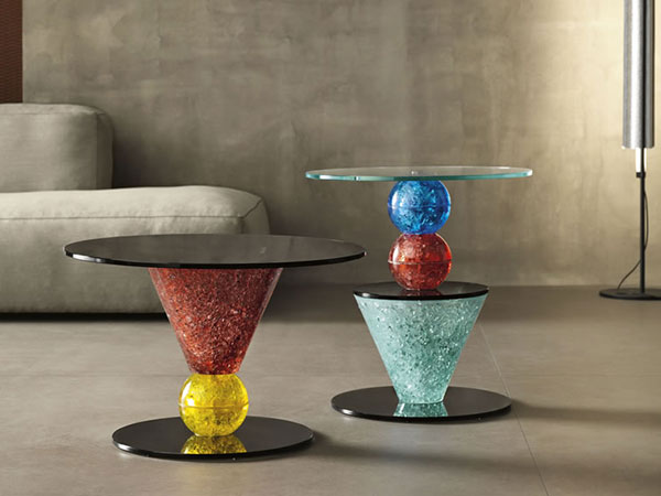 Two elements, a cone and a sphere shaped through moulds and differently juxtaposed to glass discs, give life to 6 different models also distinguished by several colours.