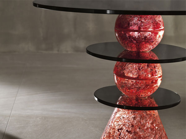 Collection of small tables defined by the new working process and the material used, a mix of glass fragments.