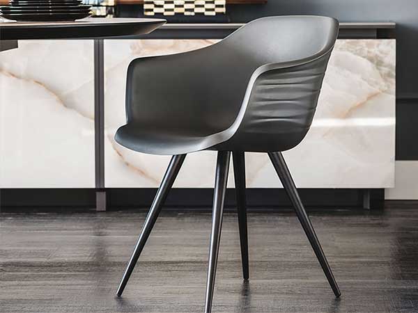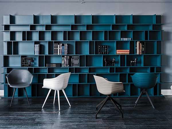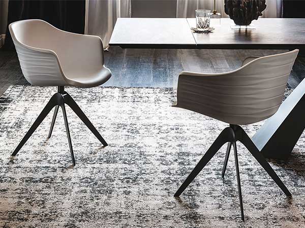 Soft polyurethane armchair with different bases. Fix or swiveling base in transparent (OP0), titanium (GFM11), graphite (GFM69), white (GFM71) or black (GFM73) embossed lacquered steel or in natural beech (F1), Canaletto walnut (FNC) or burned oak (RB) stained beech, or with 5 spokes in polished aluminum, or with wheels in black painted aluminum. Seat and back in monochrome polyurethane available in white (P01), lino (P02), fango (P03), petrolio (P04) or antracite (P05) colors, or two-tone polyurethane back petrolio (P04) and front fango (P03). For supplies of more than 50 pieces other colors are available. New 4 spokes base in graphite, white or black nylon available in swiveling version (401-T) and on wheels (401-C). Fireproof seat 1 IM – CRIB5.