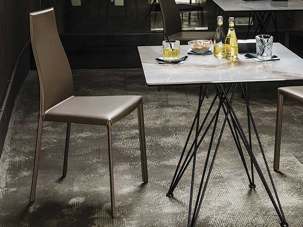 Chair with steel frame covered in leather as per sample card. Standard or in contrast stitching.