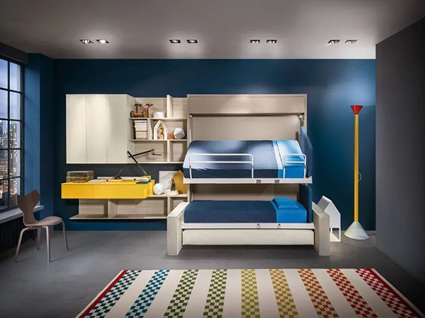 Kali Sofa is a transforming foldaway bunk bed system with the patented CF09 slatted bed base and patented sofa, which transforms into the night-time version with a simple movement: the backrest cushions are removed and as the lower bed is opened, the sofa tilts backwards and slots in underneath the bed.‎ The system features a fold-down opening mechanism and safety device that prevents accidental opening and closing.‎ Tilting mechanism with gas springs and device that cushions movements, completely contained in the side of the structure, thanks to patented technology and special manufacturing.‎ In the bunk bed position, the anodised aluminium ladder is fixed to both the beds and also acts as an additional support.‎ The upper bed features a mechanism to pull bed down to make the bed easier, and the protection barriers are reclining in the metal and padded versions.‎ The fabric headboard reclines, depending on the kind of barrier used.‎ Kali Sofa has a LED light system with a certified anti-shock mechanism in compliance with relevant regulations.‎ The system is produced 194,3 or 220 cm; high H 220 cm features a storage element with a tilting door.‎ Kali Sofa is also available in the Standard and Board (large desk) versions