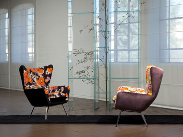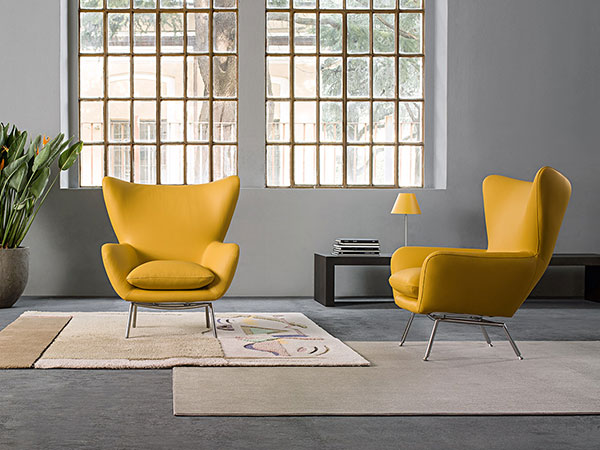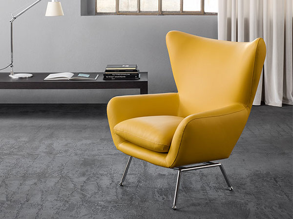 Armchair with a curved tubular steel frame that is padded with resilient polyurethane foam and upholstered with fabrics or leather from our collection.
