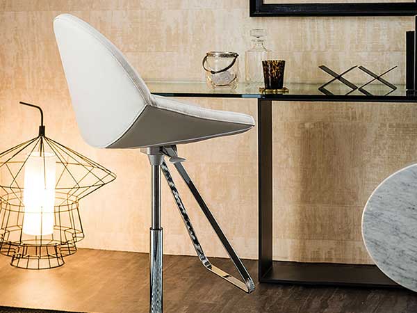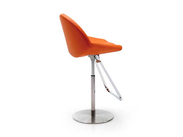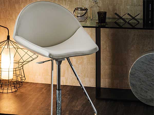 Swiveling stool, adjustable in height, with satin stainless steel base plate and column, footrest and gas piston in chromed steel (08) or with base plate, column, and footrest in black (GFM73) embossed lacquered steel and gas piston in chromed steel (08). Upholstered seat covered in fabric, synthetic nubuck, micro nubuck, soft leather or synthetic leather as per sample card. The soft leather, synthetic nubuck, micro nubuck and synthetic leather covers are not removable.