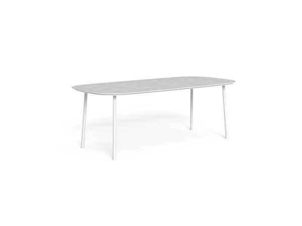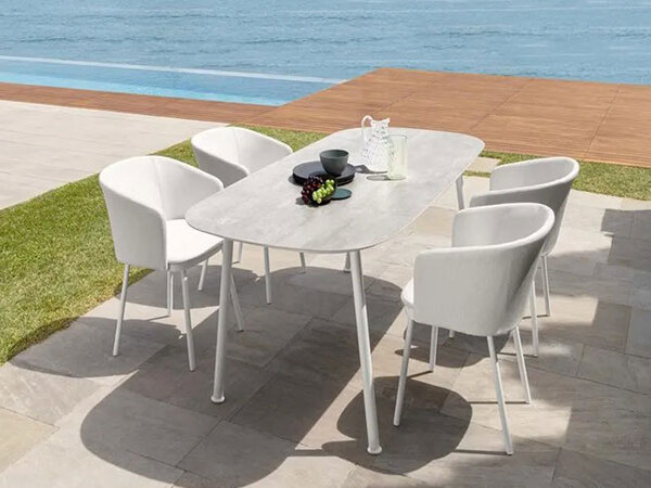 The rectangular dining table is the centerpiece of an outdoor living zone decorated in the name of conviviality, thanks to the chance to welcome up to 10 people. Slim and geometric shapes characterize the top, in stoneware, and the aluminium frame. Weather-resistant, it is ideal to add a touch of elegance to your outdoor dining space. Available in 2 sizes.