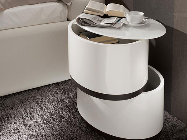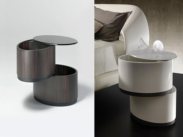Nightstand with 2 drawers in curved wood in matt or shiny lacquered or in matt Ebony. Top in lacquered glass and leather cat.C details between the drawers. Also available in a leather cat.C, Nabuk, Colorata, Dune version, with top in lacquered glass in same colour. Details between the drawers in satin Brass (104M) or Titanium (101M) finish.