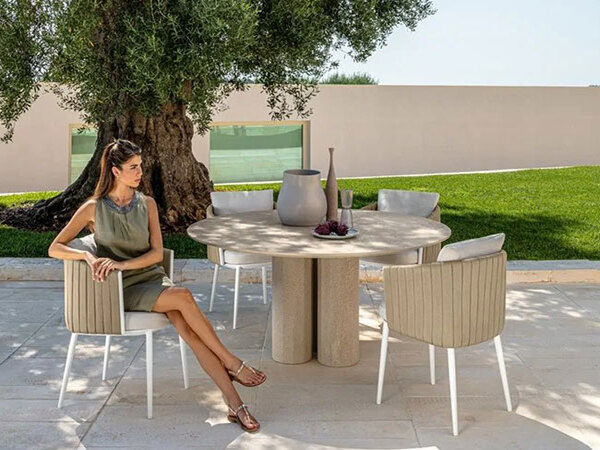 The table, available with either a concrete or an Linas frame, consists of a top resting on a substantial, monolithic base characterized by three faceted columns. The same concept is also repeated in the coffee table. The idea started from the desire to design a collection of single-leg tables suitable for outdoor life, an object with a marked monolithic appearance. The result is a piece featuring minimal shapes that, when combined into a single base, create a strong distinctive detail.