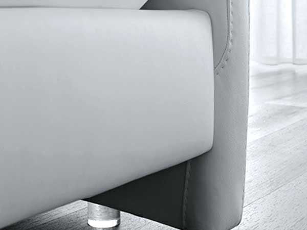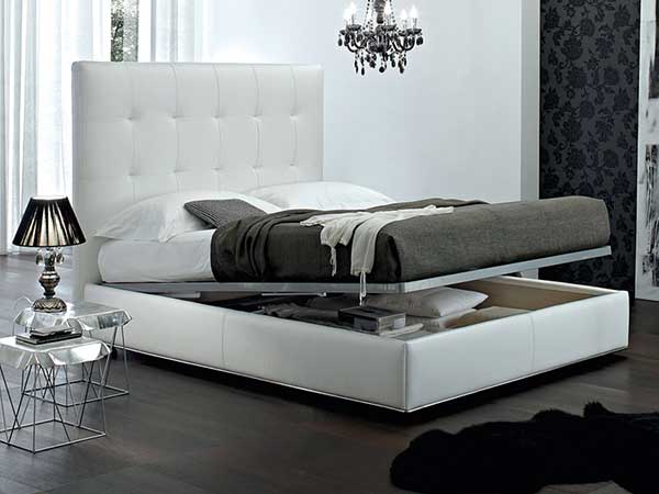 Liteli, a dream bed: seen at a glance, by the impressive quilted headboard and the careful details, like the front base in bright metal and the back legs in plexiglas.