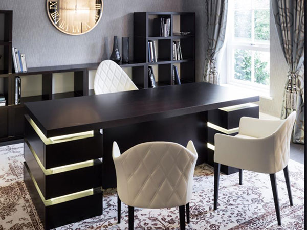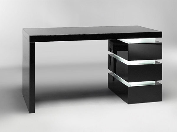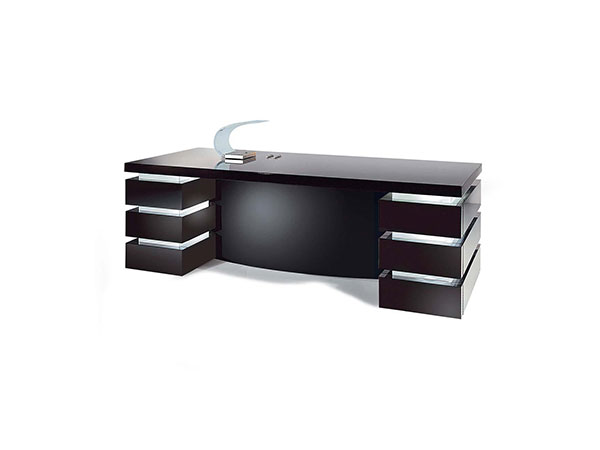 Desk in wood shiny lacquered, shiny ebony or Canaletto walnut. Single or double drawer’s unit with partitions in etched glass with internal lighting. Wooden top with insert in lacquered glass for shiny lacquered version.