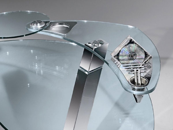 Desk with shaped tops in tempered 15 mm thick glass. Base and support in aluminium painted metal. Optional available: round glass shelf for printer and metal PC-tower support.