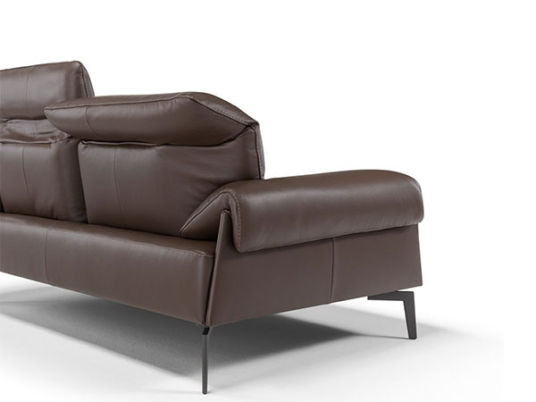 The side is characterized by a sloping panel that leaves the seat cushion free to view, partially revealing the back, so the sofa can be easily placed in the middle of the room. The very soft cape armrest recalls the design and comfort of the headrests – reclining in multiple positions.