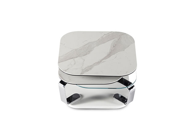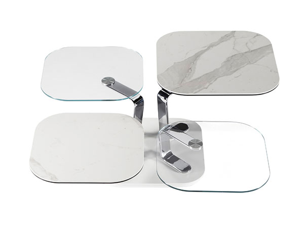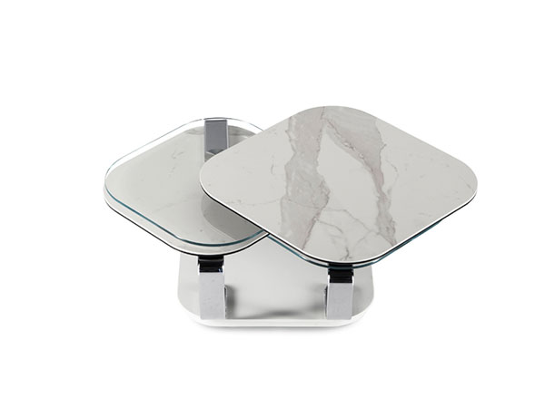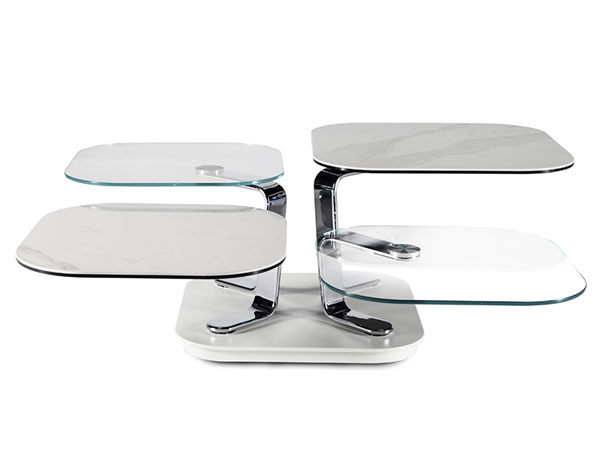 EXTENSIBLE COFFEE TABLE WITH 4 GLASS OR CERAMIC TOPS. EQUIPPED WITH AN INNOVATIVE DOUBLE SYNCHRONIZED MECHANISM THAT ALLOW THE 4 TOPS TO BE OPENED AT ONCE, WITH A SIMPLE GESTURE AND BE AT THE SAME TIME PLACED IN DIFFERENT DIRECTIONS. SUPPORTS IN PAINTED OR CHROMED STEEL.