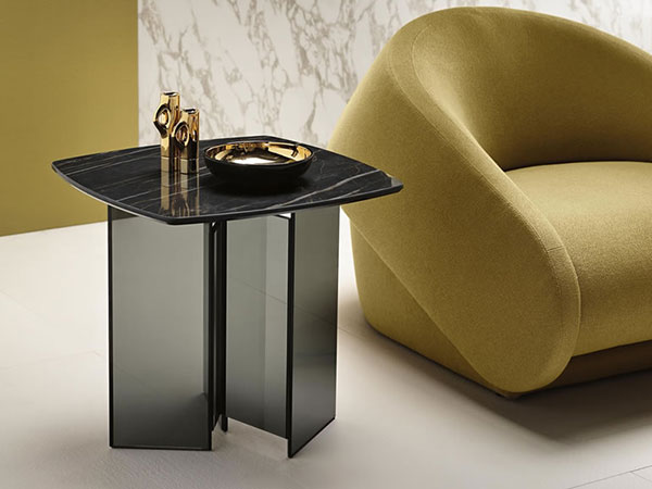The table tops are in the 3 new polished finishes in ceramic+glass with marble effect.