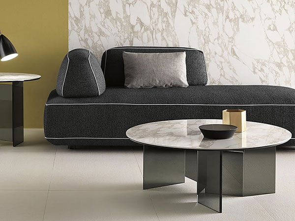 The table tops placed on the base are in the 3 new polished finishes ceramic+glass with marble effect.