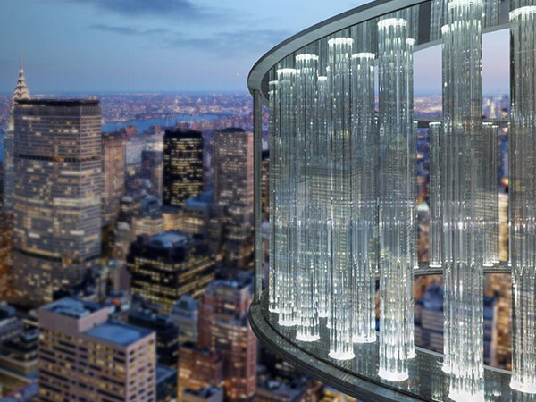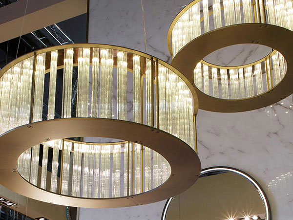 Suspension lamp with metal structure in satin brass or titanium finish and solid transparent glass elements. Ceiling support in mirror glass and Led system.