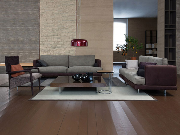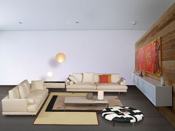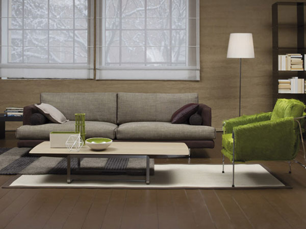 Sofa with a metal frame incorporated within the resilient urethane foam padding. All-feather cushions for the seating and backrest with leather upholstery. The series comprises armchairs, linear and corner sofas with chaise longues, poufs, and small padded tables.