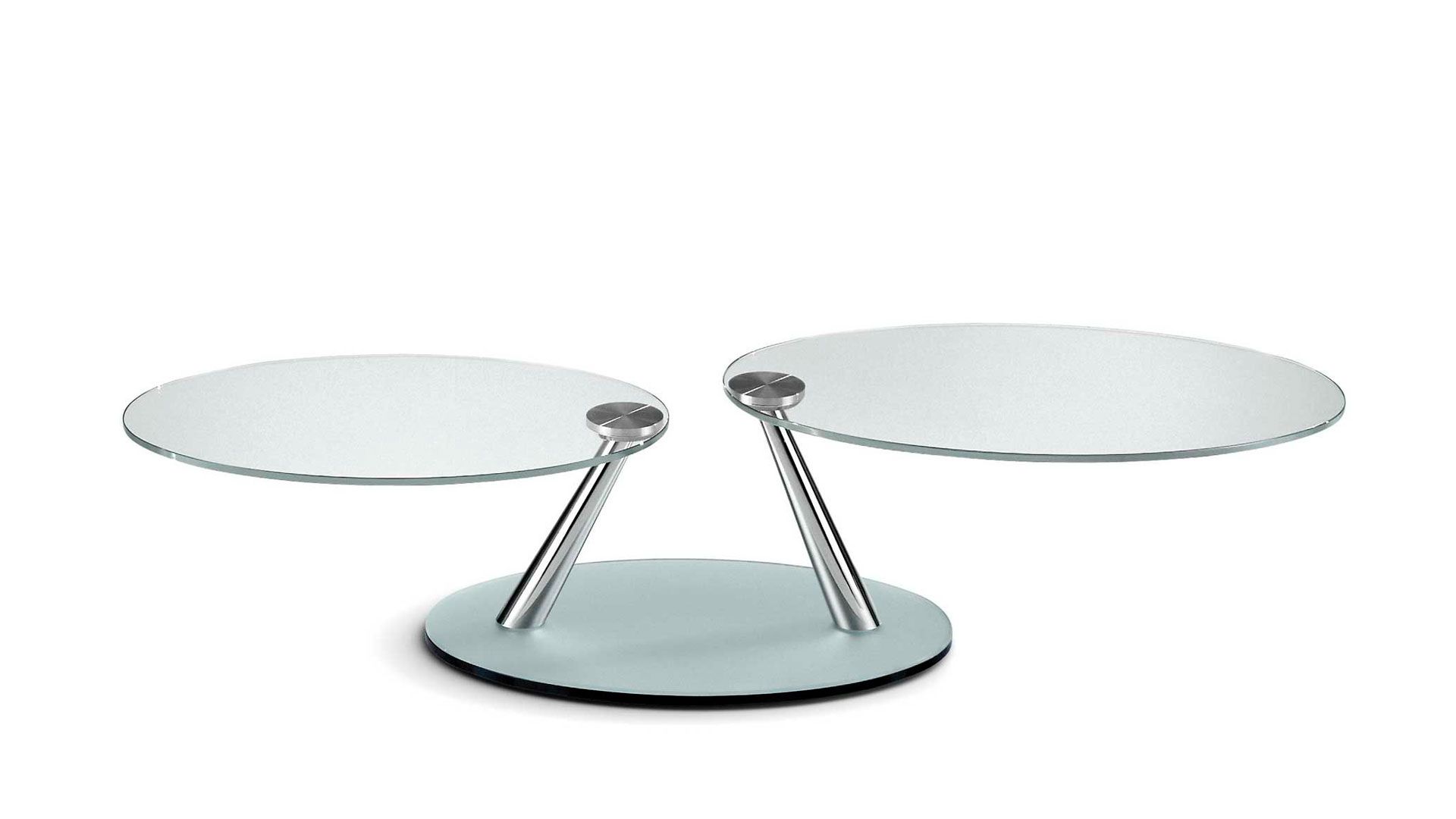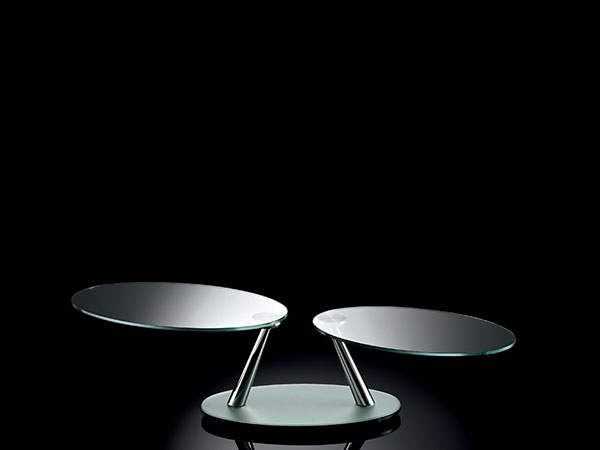 EXTENDIBLE COFFEE TABLE WITH SYNCHRONIZED REVOLVING CRYSTAL TOPS. SUPPORTS IN PAINTED OR GALVANIZED STEEL. THE BASE CAN BE IN STRATIFIED GLASS AND IT IS EQUIPPED WITH A MECHANISM FOR SYNCHRONIZED ROTATION OF THE TOPS THAT ALLOWS AN AMPLE MODULATION OF THE FORM.