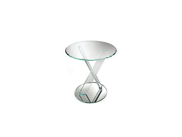 Side table with legs in transparent extraclear 10mm thick glass and base in mirror glass. Also available with base and legs in lacquered or etched lacquered glass. Top in extraclear transparent glass 10 mm th. with 45° bevel.