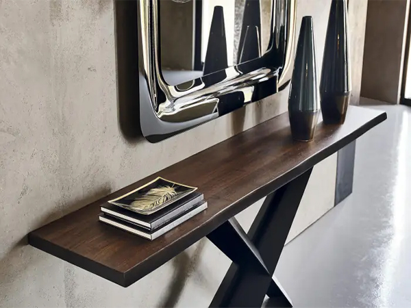 The Minal console table makes a grand impression in a modern home. The sculptural base features an X-shape and multi-dimensional elements for a captivating touch. Perfect in a hallway or against a wall in a living room, the table has ample space to display pieces of contemporary decor. Thanks to the use of the best quality materials, it is sustainable for years to come.