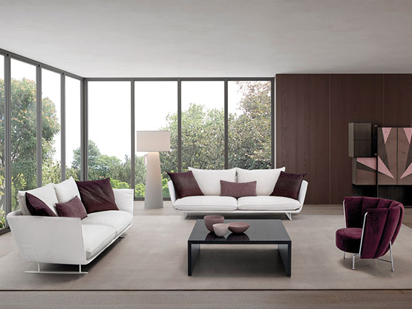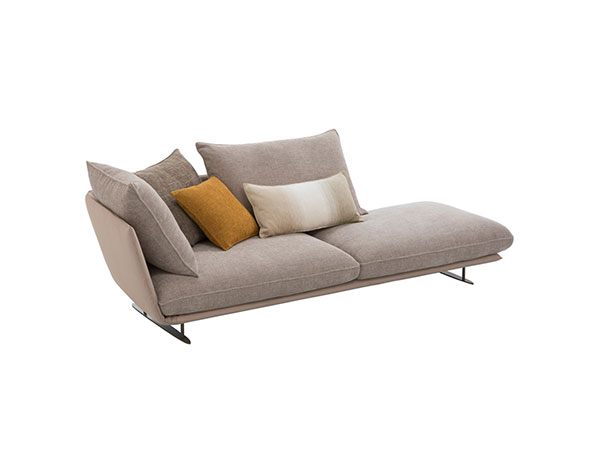 This sofa features an extraordinarily comfortable high backrest created by a metal frame that encompasses the sides, back and base of the sofa. A special oval-shaped foot raises the sofa, giving it a lighter appearance. This fashion-led sofa features cushions in different textures, designs and seams with inserts made from other materials. Custom designed special embellishments showcase and emphasise each and every cushion.