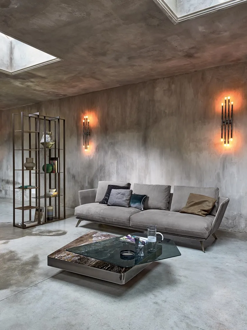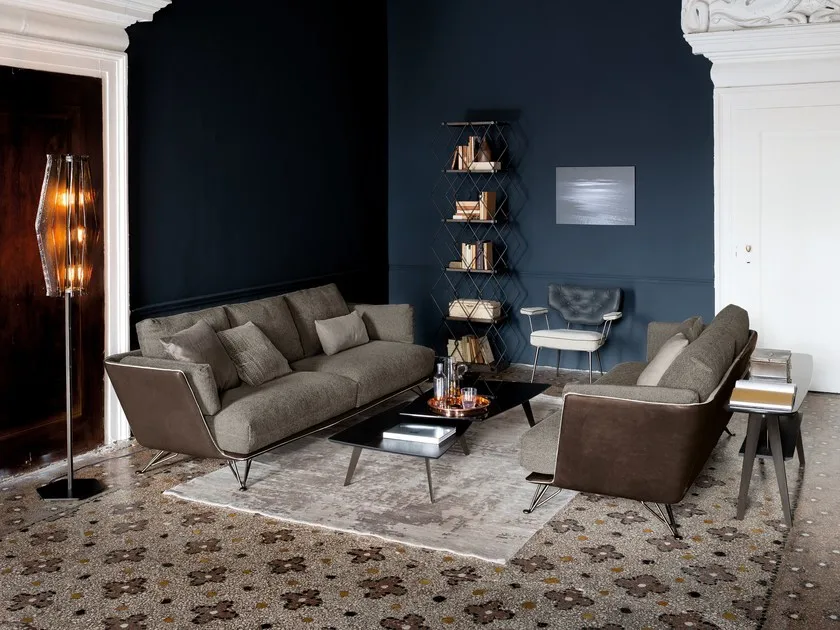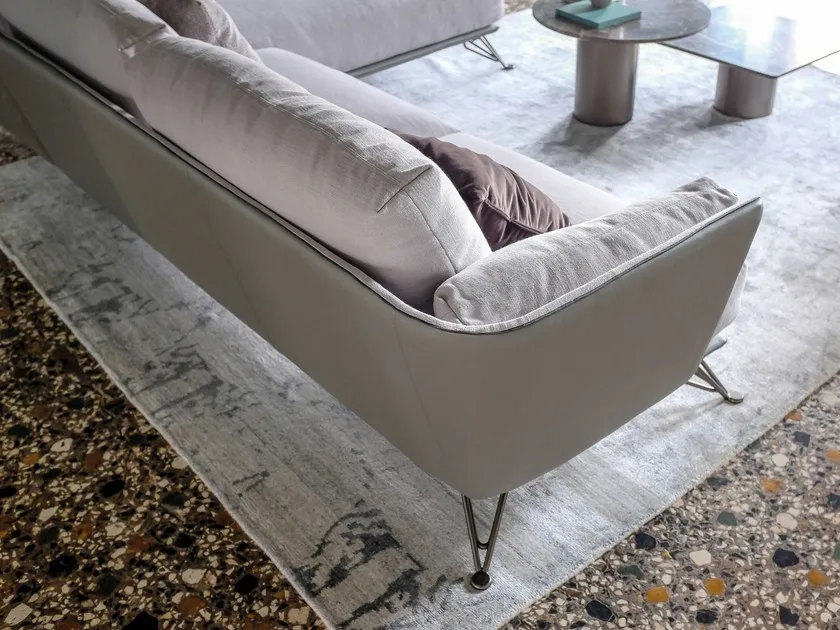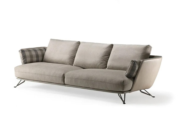 Mori, in its gentle and simple form, has a light and thin structure that envelops the seat and back cushions. Light piping runs around the perimeter of the structure which is slightly inclined: tailoring details which simultaneously strengthen and lighten the structure. The lightness of the sofa is emphasised by thin metal legs, limbs which bond the structure and floor through joining metal plates. It can be used in any setting from classic and formal to minimal, thanks to the versatile combinations of leathers, fabrics and finishes.