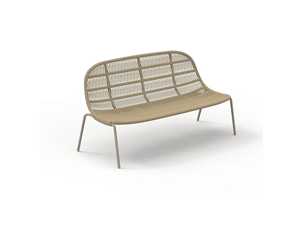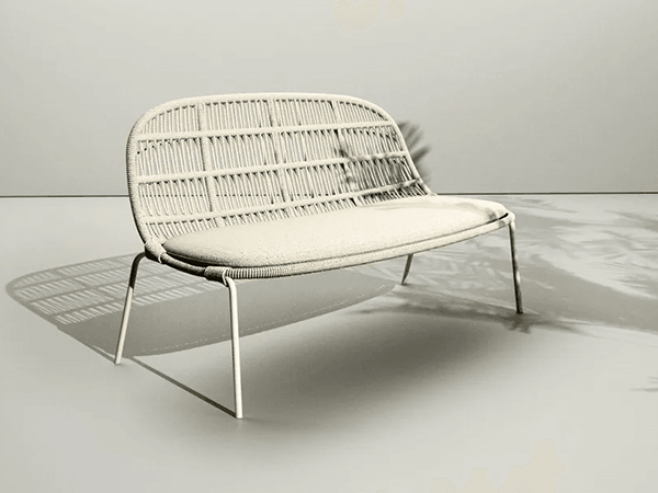 The Nama 2 Seater collection is characterized by its ample, intertwined forms that create shadows, inspired by palms swaying in the ocean breeze. In particular, the organic profile of the chaise longue brings to mind the surface of wave-washed stones, adding strong natural lines to the collection. This family of products includes chairs, loungers, sunbeds, poufs, and sofas made with rope woven around the frames in a way that creates a play of light and shadow as the sunlight moves through them.