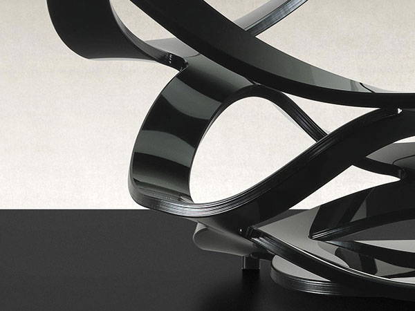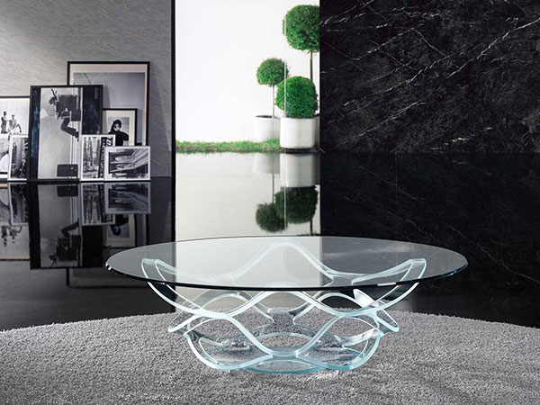 Coffee table with curved glass base 15mm thick available in extra clear transparent, etched, lacquered or etched lacquered glass. Glass top 12 mm thick with 45° bevel.