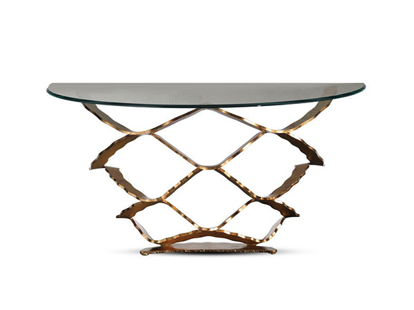 Console with base in forged iron in gold leaf, silver leaf, brass, dark brass, titanium, dark titanium finish. Glass top 15 mm th. with 45° bevel