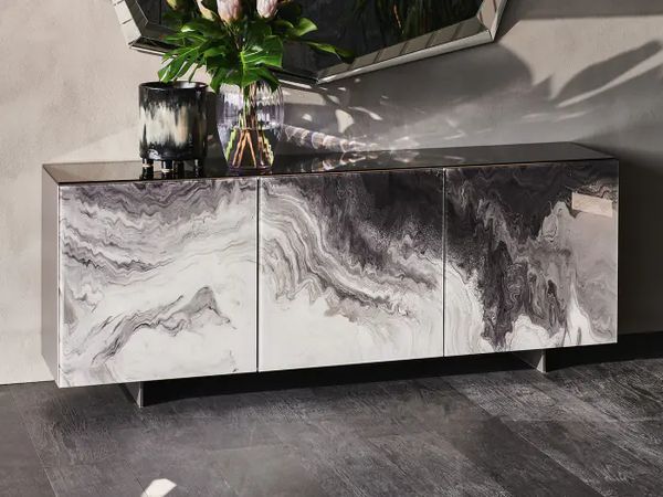 Simultaneously add a practical storage solution and stunning piece of decor to your modern home with the dazzling Ocus sideboard. The sleek silhouette features a combination of luxurious and incredible detailed beveled glass and shining metal that complement one another. With plenty of room on top, you can have ample decor opportunities, while the roomy interior compartments with glass shelves store and organize belongings you want out-of-sight. Optional drawers are available for added organization.