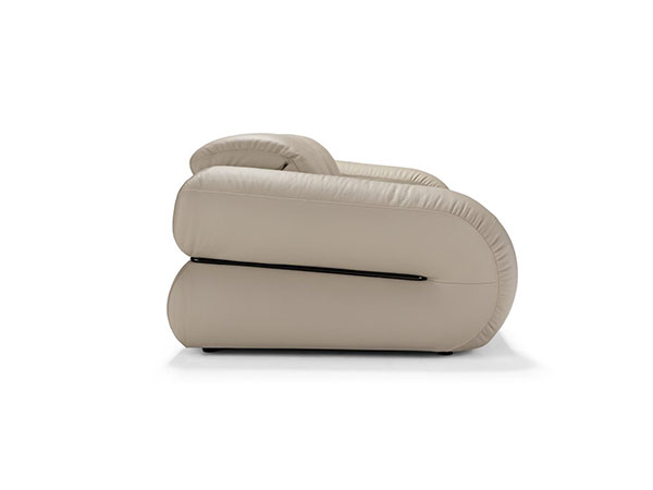The full armrest that curves in on itself, featuring a metal profile, creates a strong visual impact.