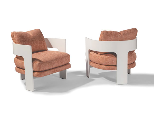 The On 3 (originally conceived in 1970 by Milo Baughman) is an iconic midcentury modern chair design packing lots of dramatic punch in a thoughtfully minimal package. Its striking curvilinear frame is carved to form three, stout legs that support a supple upholstered seat and back filled with trillium and poly blend down. Baughman’s signature glamor is infused into the chair’s dramatic frame – available in either Walnut veneer, polished stainless steel, dark bronze or slip match Maple veneer in several wood finishes and paint colors. The On 3 lounge chair can be upholstered in any of Thayer Coggin’s in-house curated fabrics or leathers. For the maple wood base option select from any of our TC wood finishes.