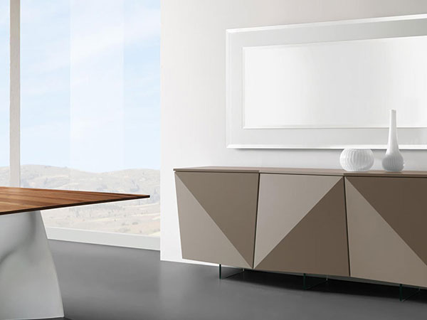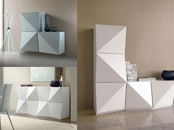 Modular storage unit in wood with left or right opening, available in matt or shiny lacquered finish, Canaletto walnut, silver or gold leaf or in satin brass or titanium finishing. It can be used to make compositions in various sizes and shapes, hanging or at the floor with glass legs and top.