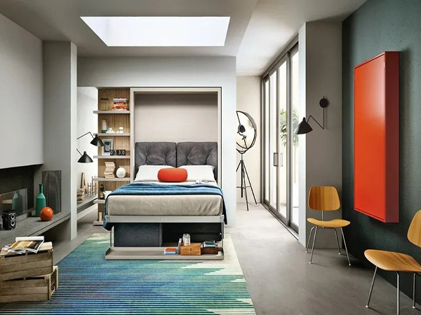 The sofa is produced in two versions, both of which have a pillow compartment underneath the seat part.‎ The W 301 cm version features W 27 cm armrests, while the W 173 cm has W 6 cm armrests.‎ Both the large section with 27 cm armrest and full W 173 sofa are perfectly aligned with the tilting transforming bed system positioned behind it.‎ Opening the bed, automatically the seat slides forward and the backrest flattens out.‎ Both the seat pad and backrest are made from non-deformable foam in differing densities and upholstered in polyethylene terephthalate resin.‎ All covers can be removed.‎ The model also features rectangular and oval loose cushions and a pouf which can be tucked away under the open bed