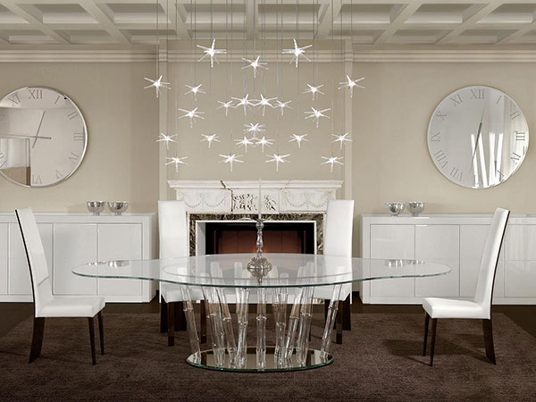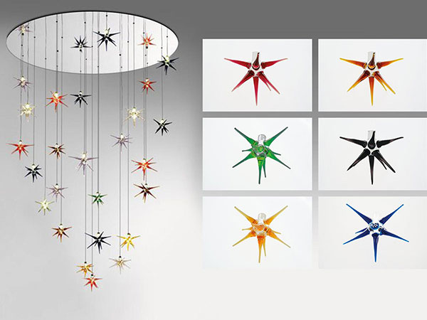 Chandelier with support in white or black lacquered or mirror glass and pendant stars in blown borosilicate glass, transparent or coloured with LED. It is possible to realize customized versions for dimensions, length and shape.