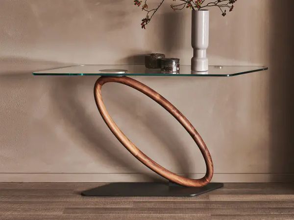 The Ours console table is a stunning work of art that can be fittingly placed where everyone gets to appreciate its presence. With a Canaletto walnut finished sculptural base that seemingly defies gravity with its orbital shape, the console is a must-have product. The wood or glass tabletop provides plenty of decor opportunities for a convenient touch.