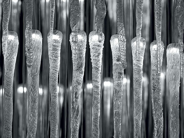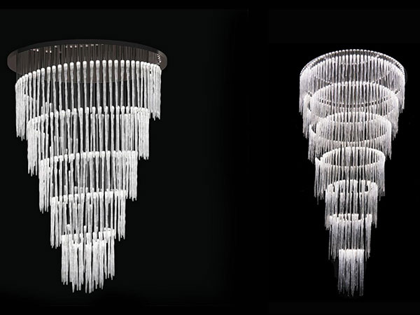 Chandelier with mirror glass support and suspended solid Murano glass elements with LED inside. Allows various types of customizations for dimensions and shapes