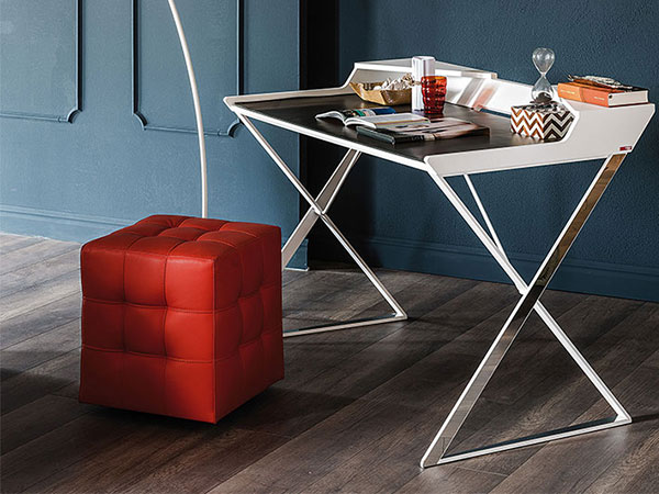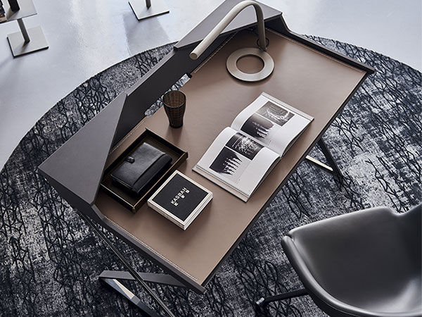 Desk with matt graphite (OP69) or white (OP71) painted frame and profile in polished stainless steel. Top in lacquered graphite (GF69) or white (GF71) embossed MDF. Leather pad as per sample card.