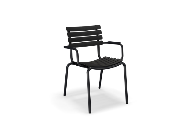 Reco Dining chair comes in 4 mono colors with the choice of adding armrests in bamboo. The aluminum frame combined with the UV protected plastic lamellas, keep the maintenance to a minimum.