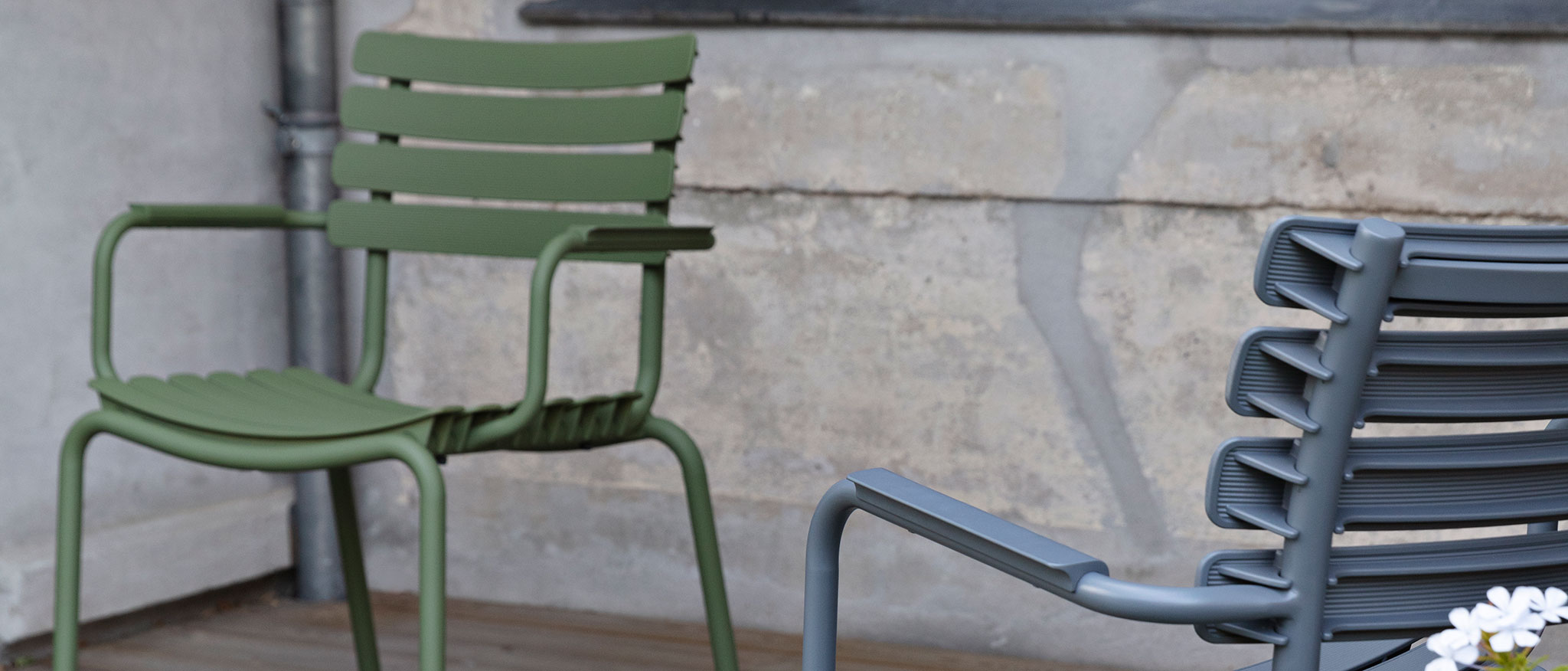 Reco is a line of chairs with wide plastic lamellas clipped on a light powder coated aluminum frame.