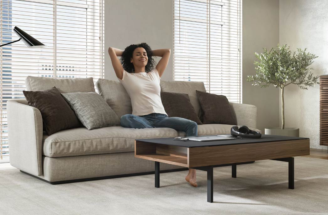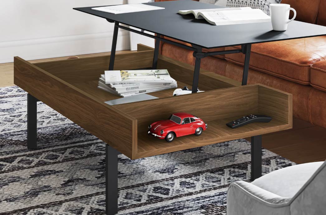 The Reveal coffee table top raises to a comfortable height for seated use, while storage compartments keep everyday essentials from gaming controllers to remote controls, laptops, and reading material close at hand.