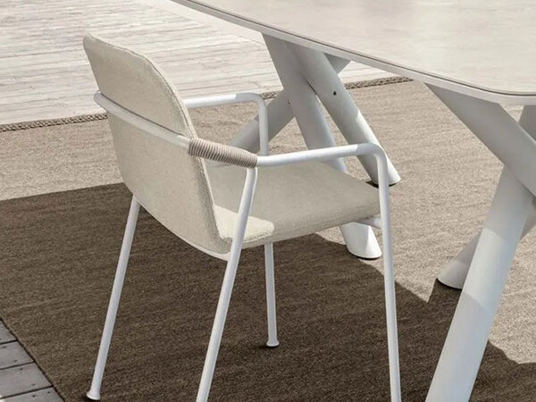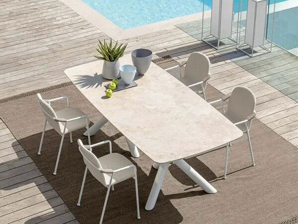 Contemporary and elegant, the dining table will fulfill your needs for a convivial and timeless piece of furniture in your outdoor dining area. The thin and refined top in stoneware balances the unique design of the dynamic aluminium legs, core element of this furniture piece. The high quality materials, resistant to weather conditions and to UV rays, make this table a prefect product for the outdoor dining area.