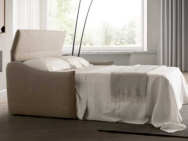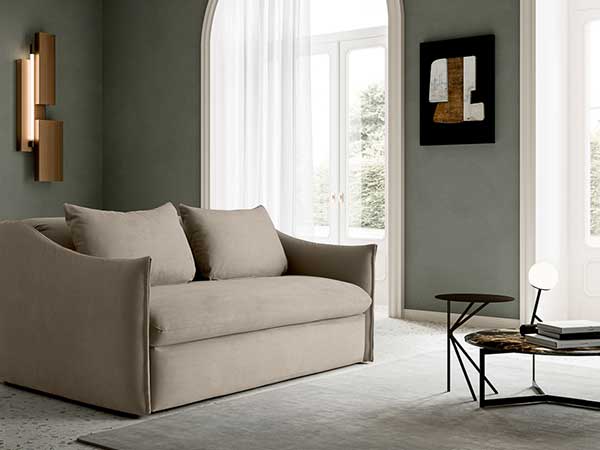 A sofa comfortable like a bed, characterized by the softness of its shapes, defined by wavy armrests and wide pillows in the back portion. This model with a unique type of seat, offers the highest comfort in the smallest space, without sacrificing its strong appearance factor. The armrests are removable thanks to the bayonet locking system. Available in leather and fabric completely removable.