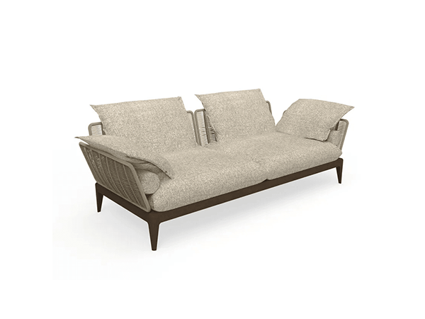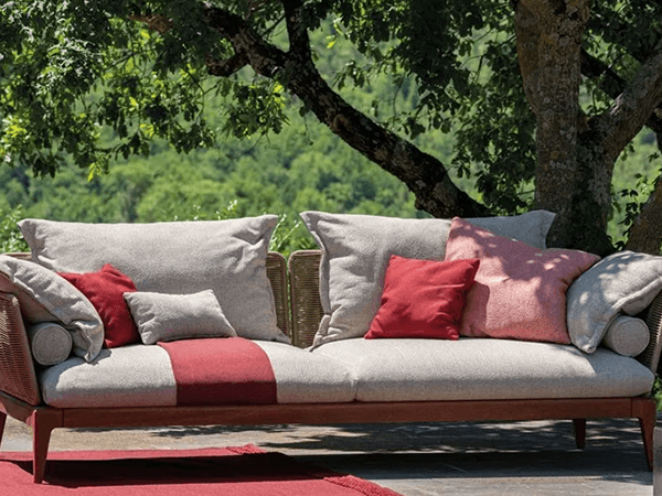The Ruise 3 Seater Sofa is realized with a nautical and nature-inspired style. The structure indeed is entirely realized in wood while the cushions’ fabric, weather conditions resistant, makes the product perfect for outdoor living area. The use of synthetic rope is reserved to the armrests and to the wide seat, ideal for relaxing moments outside.