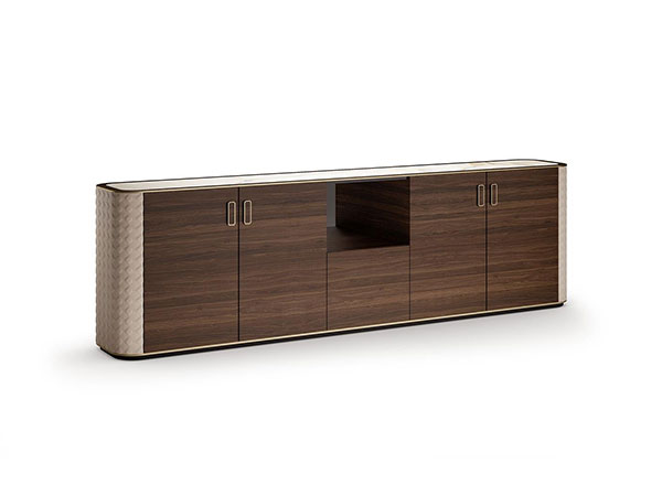 Buffet with wooden structure. Doors with brass handle with wood detail. Sides covered with leather. Top in Marble glass with profile in satin brass (104M) finish. Intnal shelves in glass.