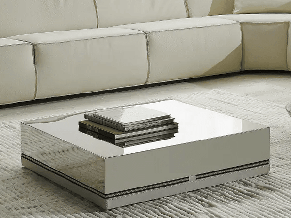 The Seona square coffee table offers a minimal surface with great durability and superior craftsmanship. With incredible attention to detail, the table stands out in a modern living room thanks to the shining zipper and contrasting materials. The stainless steel top is a luxurious feature that is reflective for added appeal. By using the best quality materials, it will be a staple piece of furniture for a long time.
