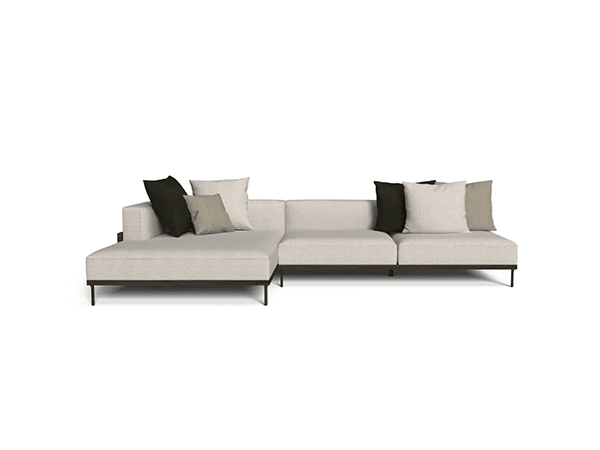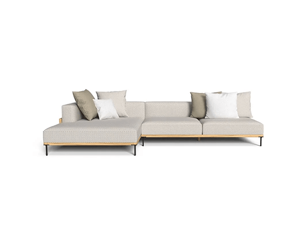 The teak rigid and geometric structures characterizing Soft collection support the embracing and important seats of the outdoor modular sofa, creating a perfect balance between shape and volume. The modular sofa consists of 2 square elements (left and right) and two longue elements (left and right) that allow many combinations to obtain your own desired shape.