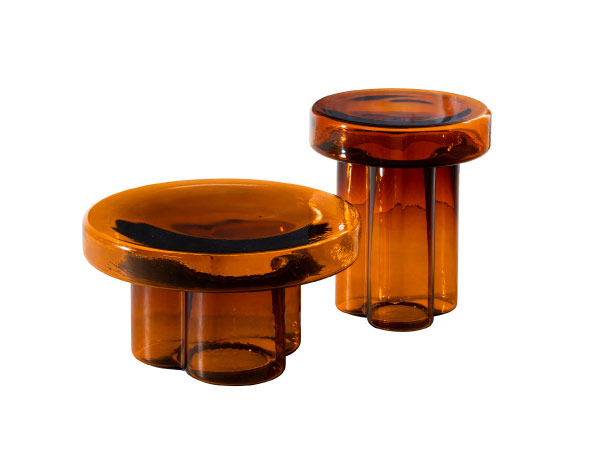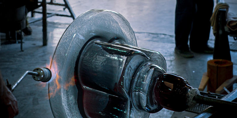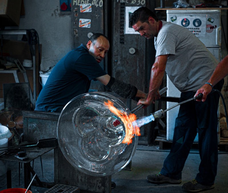 Solari was born upside-down, with a puff of air. It weighs 20 kilos, and it is blown, drawn out and shaped by three master glassmakers. The result is a single volume of glass with three large petals forming the stem.