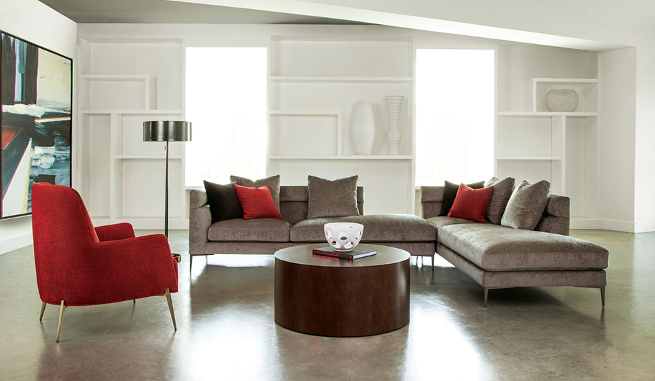Classic modern living. This contemporary sofa is featured with Mia lounge chair and Milo Baughman wood Drum table.