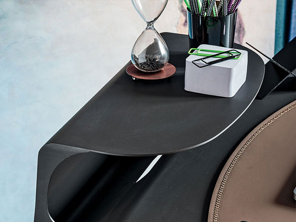 Desk with frame and top in titanium (GFM11), bronze (GFM18), graphite (GFM69) or white (GFM71) embossed lacquered steel. Leather pad as per sample card.