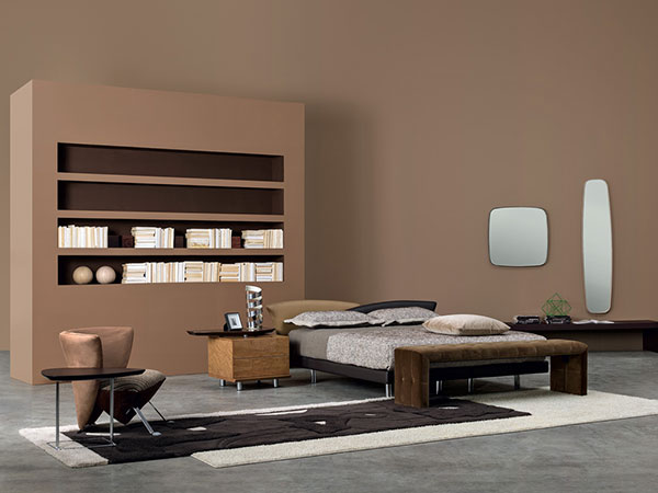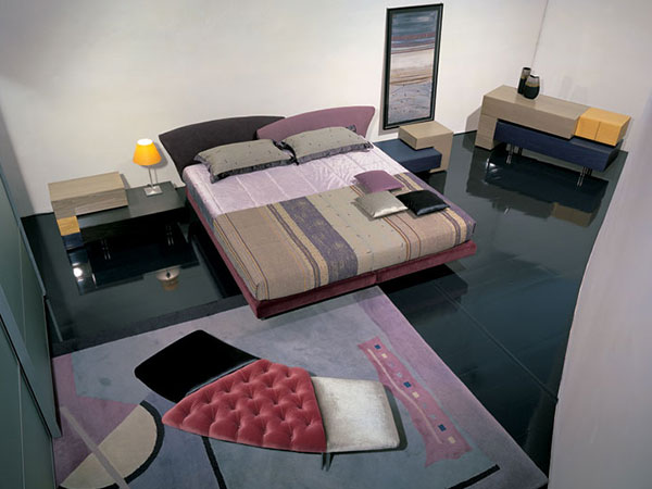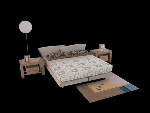 Bed with two single boxsprings with steel frame in resilient polyurethane foam. Headrest with two curved overlapping elements in fabrics and leathers of our collection. Available also as twin bed with asymmetric headrests. Headrest in rigid quilted Alcantara is optional.